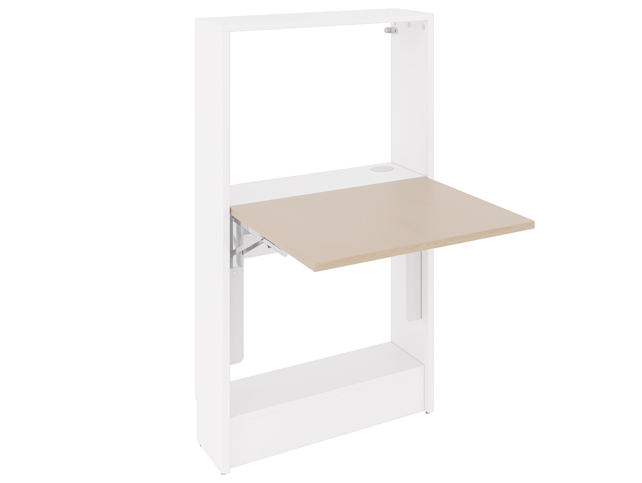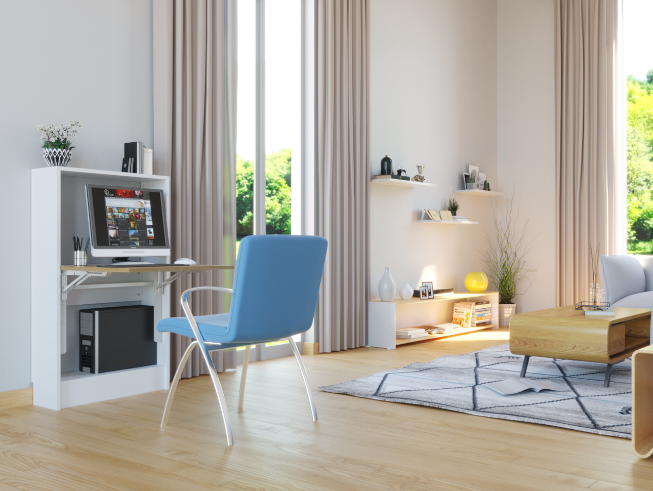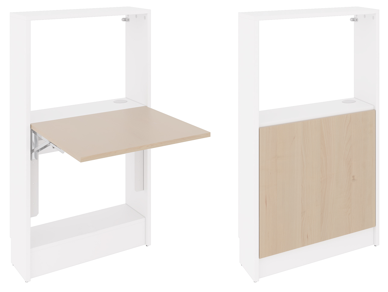Ce meuble mural de faible profondeur, avec plateau rabattable, offre un espace de télétravail confortable pouvant accueillir écran, clavier et unité centrale.