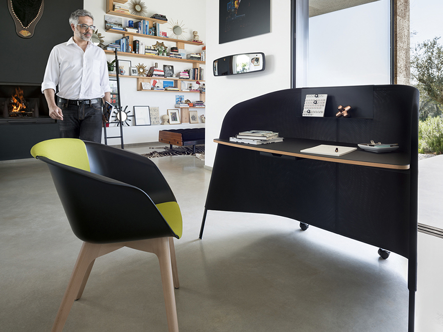 Le Secretair est composé d’un cadre en tubulaires, la structure portante de ce secrétaire est munie d’un revêtement maillé de type résille qui soutient le plateau et sert en même temps de séparation visuelle et acoustique. Tel une oasis de bien-être, il facilite la concentration au travail – accentuée par les flancs inclinés de la structure.