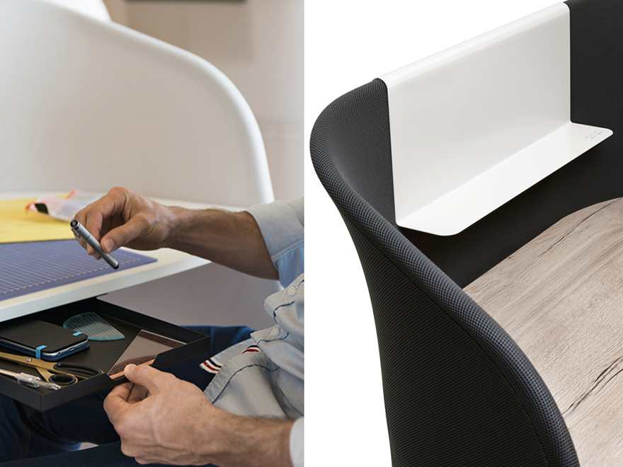 Les détails qui ont de l’importance : un tiroir discret de rangement sous le plateau et une desserte en métal colorée qui sert de tableau magnétique.