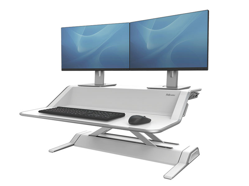 Cette station assis-debout peut accueillir les accessoires de bureau grâce à ses deux surfaces de travail.